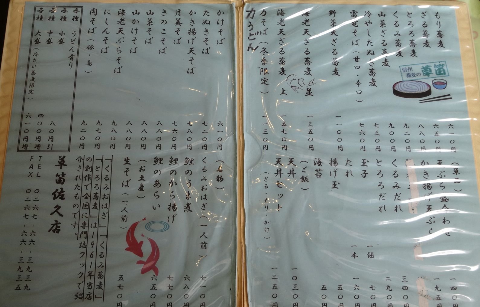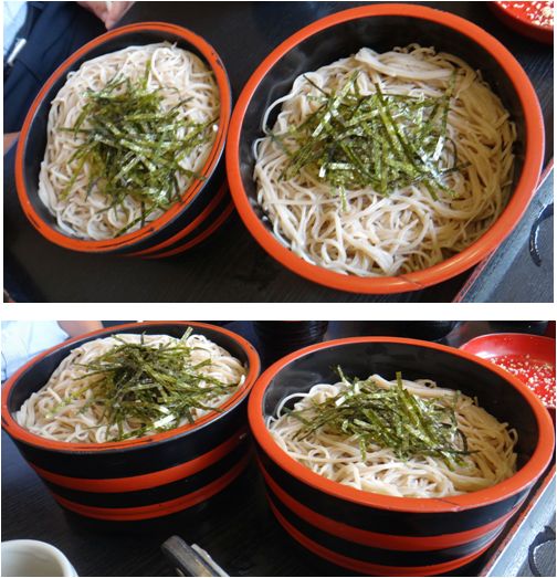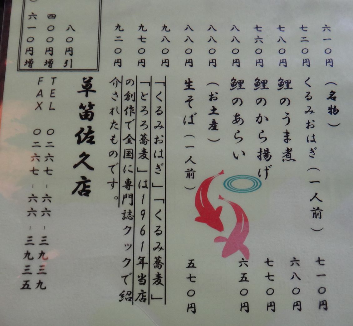 メニューは蕎麦の他に「くるみおはぎ(記事道の駅雷電くるみの里(長野県東御市))」や鯉料理(あらい,うま煮)も用意されています。尚且つ、うどんまで。待合室にあった「ゆべし」がすでに売り切れだったので今回は「くるみおはぎ」を別に注文し、同行者各人は自分の好みの量の盛り蕎麦を注文。