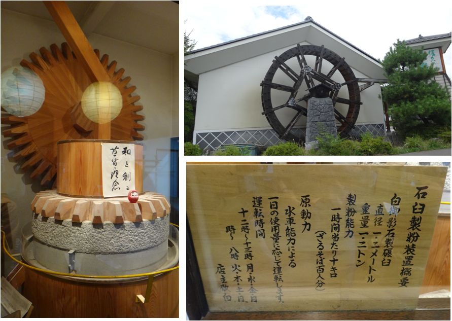 待合室には他にも石臼製粉装置展示もあり、水車動力で白御影石製の臼を回して粉をひくのを時間帯によっては見ることが可能。
