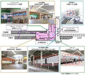 ~JR東日本は、水素エネルギーの利活用を推進しており、省エネルギー・再生可能エネルギーなど様々な環境保全技術(エコメニュー)を駅に導入する取組み「エコステ」を実施しています。横浜支社では2015年1月に川崎市と締結した包括連携協定に基づき、4月17日武蔵溝ノ口駅がCO2フリー水素エネルギーを活用した「エコステ」モデル駅としてリニューアルします。