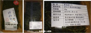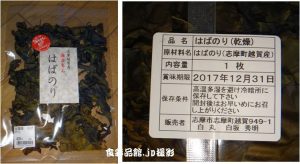 ・カヤモノリ科セイヨウハバノリ属。地域によっては雑煮に用いられるが、流通量は少ないという。「かるくあぶって食べてください」とあり、そのように食べたら結構、美味。酒のつまみにバリバリといただく。三重県志摩市志摩町越賀(こしが)は食彩品館.jpの好物の「きんこ芋」の産地でもあります。最近ではハパノリやケノリなどの養殖も研究されているとか。