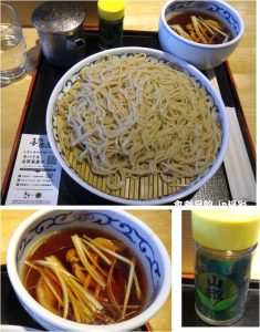 盛り蕎麦には1人1缶「八幡屋磯五郎の七味とうがらし」がついてくる。鴨せいろには「八幡屋磯五郎の粉山椒」缶がつく。
