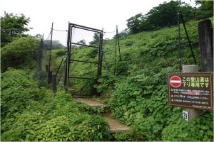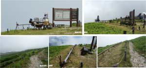 ・2017/07/28胡麻の里(岐阜県関ケ原町)訪問記================================= 山頂で1時間程過ごしたでしょうか。ガスも出てきたし、遠くの山の景色も見えにくくなってきたしということで、下山の準備。直下に下りる中央登山道ルートと東下山専用ルートがあります。荷揚げ用のモノレールに添ってルートが設置されている中央登山ルートを選択。「モノレール・スロープカー」と呼ばれている荷揚げ用モノレールは山頂の売店の方々が利用されています。