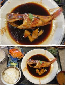 当日は海が荒れているとかで不漁。刺身は単品のみで盛り合わせは2人前以上ということで、煮魚定食をまずは選択。“釣りワガ”という表示に惹かれて。
