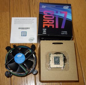 久々のパソコン自作ということで、最近のパーツの流行を確認。イチバン効果があると思われるCPUから決定。第8世代(開発コードネーム“Coffee Lake-S”)からの選択はCore i7 8700か8700Kが価格的にもお手頃。今はもう昔みたいにクロックアップとかしていないので、“K”マーク(クロックアップ対応)のついていない安価なcore i7 8700を選択。約3万円ちょっと。