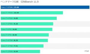 過去の資料を確認すると現デスクトップパソコンのcore i7 870は「5.37」という数値になっていました。上記グラフは“8700K”ですが、“8700”とのベンチマーク差は少ないので参考数値とすると、約3倍スコアが違います。