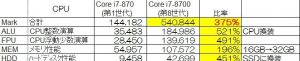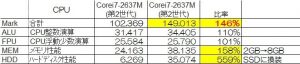 ”データは合計である“Mark”とCPU性能を現す“ALU”“FPU”、そしてパーツ換装したメモリ“MEM”とハードディスク“HDD”も新旧比較。合計数値にはグラフィックデータが入っていますが、パーツ換装していないので比較表からは割愛。