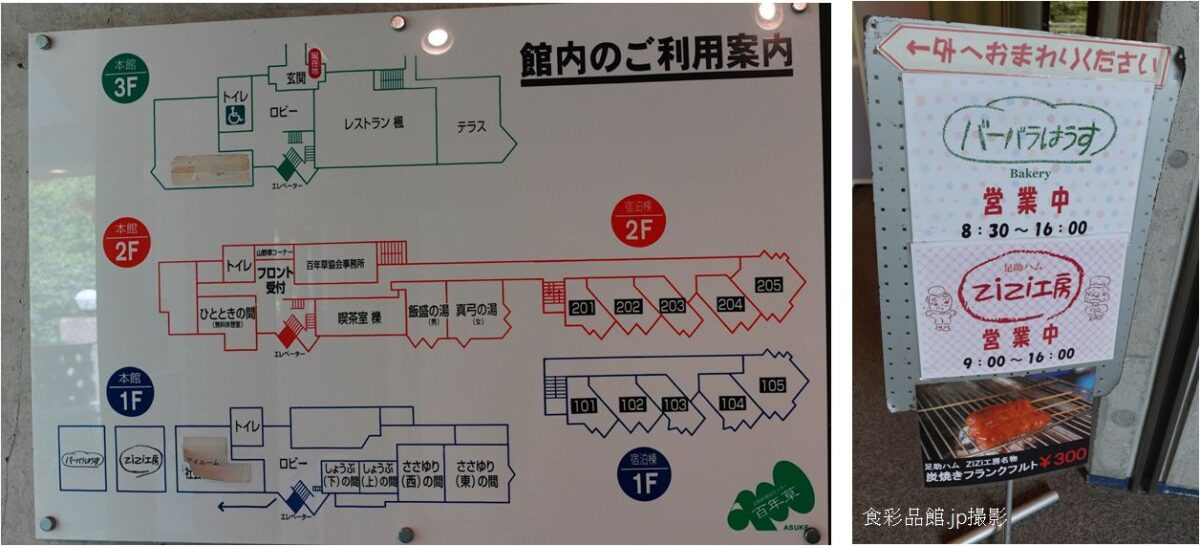 宿泊施設と入浴施設にフレンチレストラン、喫茶室、足助ハムウィンナー工房、ベーカリーショップ、そして産直コーナーもあります。