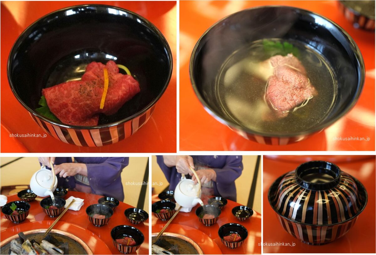 仲居さんが調理してくれます。炭をおこしてから椀に出汁を注ぐ。和田金肉すましをまずはいただく。蓋を閉めて15秒。