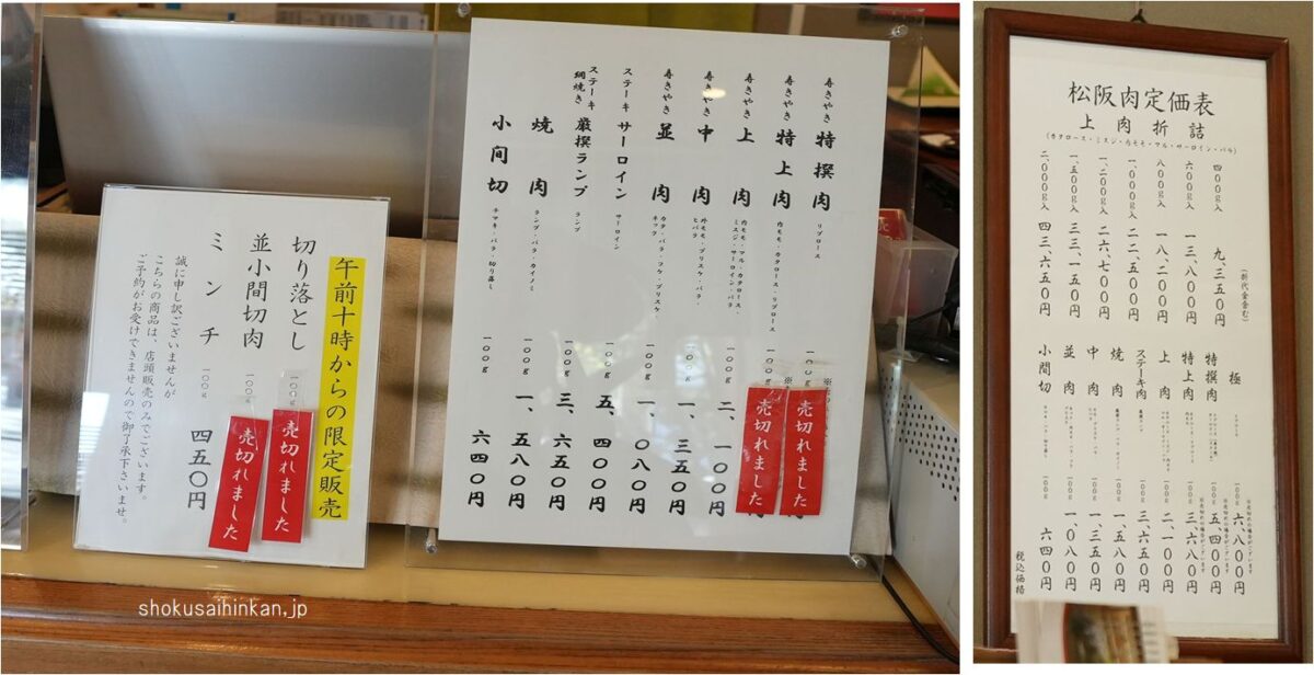 松阪牛表示。2001年までは未経産雌但馬牛を松阪周辺(雲津川~宮川)で肥育した上規格が基準だった。2002年からは基準緩和で「但馬牛,規格基準」が外された。