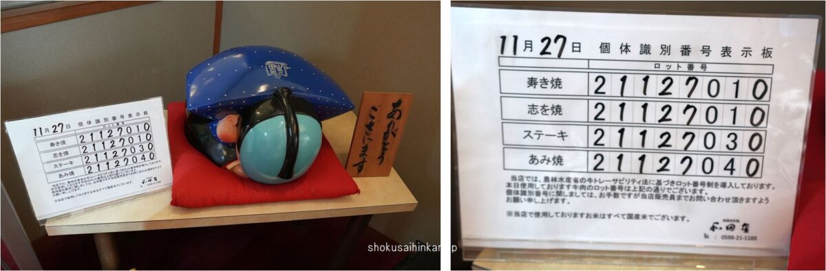 和牛香が醸し始める60℃は当然超えている。さらに保健所が推奨する75℃1分間以上には達していそう。味付けは割り下を使わず、大量の砂糖と醬油と少量の昆布出汁を使う。さすが老舗の技と感心するも、最大の目的の「和牛香」を嗅ぎ分けることに失敗しているので意気消沈。 さて、今回食べた肉を知りたい。 当店はロットナンバーで管理&店頭表示しているため個体識別番号は別途店舗に問い合わせる必要がある。(できればすぐに調べられる個体識別番号での表示をしてほしい)