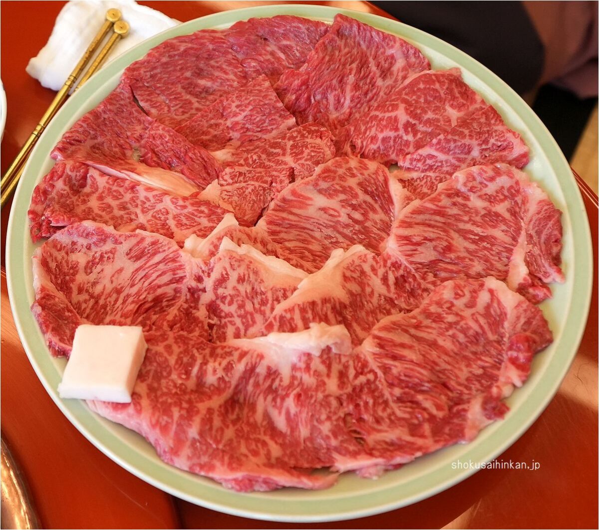 すき焼きとしては厚くスライスされているため焼肉程度の厚さ。これは「非冷凍」であるというアピールも兼ねている。非冷凍肉は薄く切りにくいけど冷凍肉はスライサーで薄く切ることができる。~冷凍の肉であればかなり薄い状態でスライスできますが、冷凍していない肉の場合はそれなりの厚さが必要となります。和田金の寿き焼やしゃぶしゃぶに使う平切り肉が一般のものより厚い理由のひとつには、冷凍しない伝統があり、それが和田金の肉の力強いおいしさにもつながっています。~(和田金HPより)ふむ。普通の牛肉はチルド温度帯(0℃前後)レベルにしたら薄くスライスできるがなあ。和田金牧場の松阪肉は脂肪融点が低いというアピールも兼ねているのかな?。・割り下は使わずたっぷり砂糖、自家製調合醬油、昆布出汁少々。
