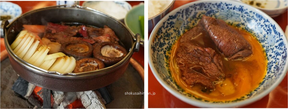 以前は和田金と銘打った久慈砂鉄鉄器(山王堂謹製)のすき焼き鍋だったが現在はプランド表示のない吊り鍋になっている。↓ 現在の吊り鍋(肉はロース肉加熱中)