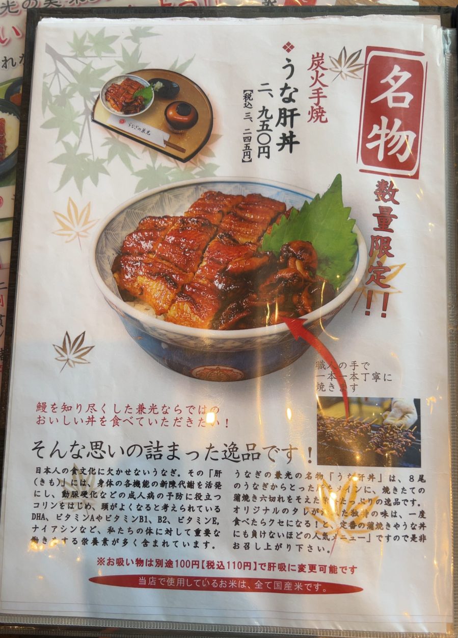 いや、初見なのでここはオーソドックスに・・・・と悩んでいると「名物 数量限定 うな肝丼3,245円(税込)」のチラシが目に留まる。