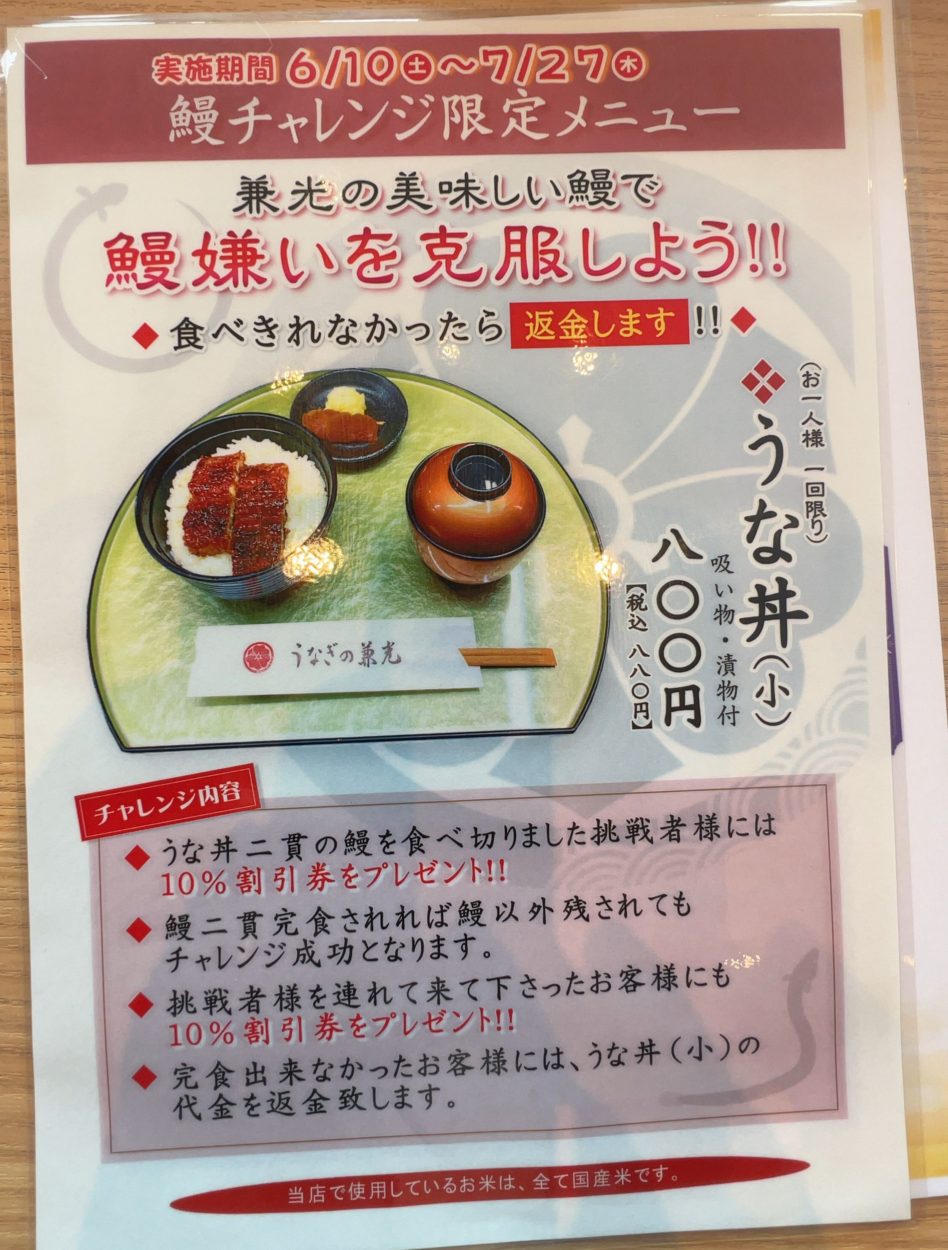 そしたら6/10~7/27まで限定の「鰻チャレンジ限定メニュー」880円(税込)が提供されている。660円メニュー同様に2切が乗っている。