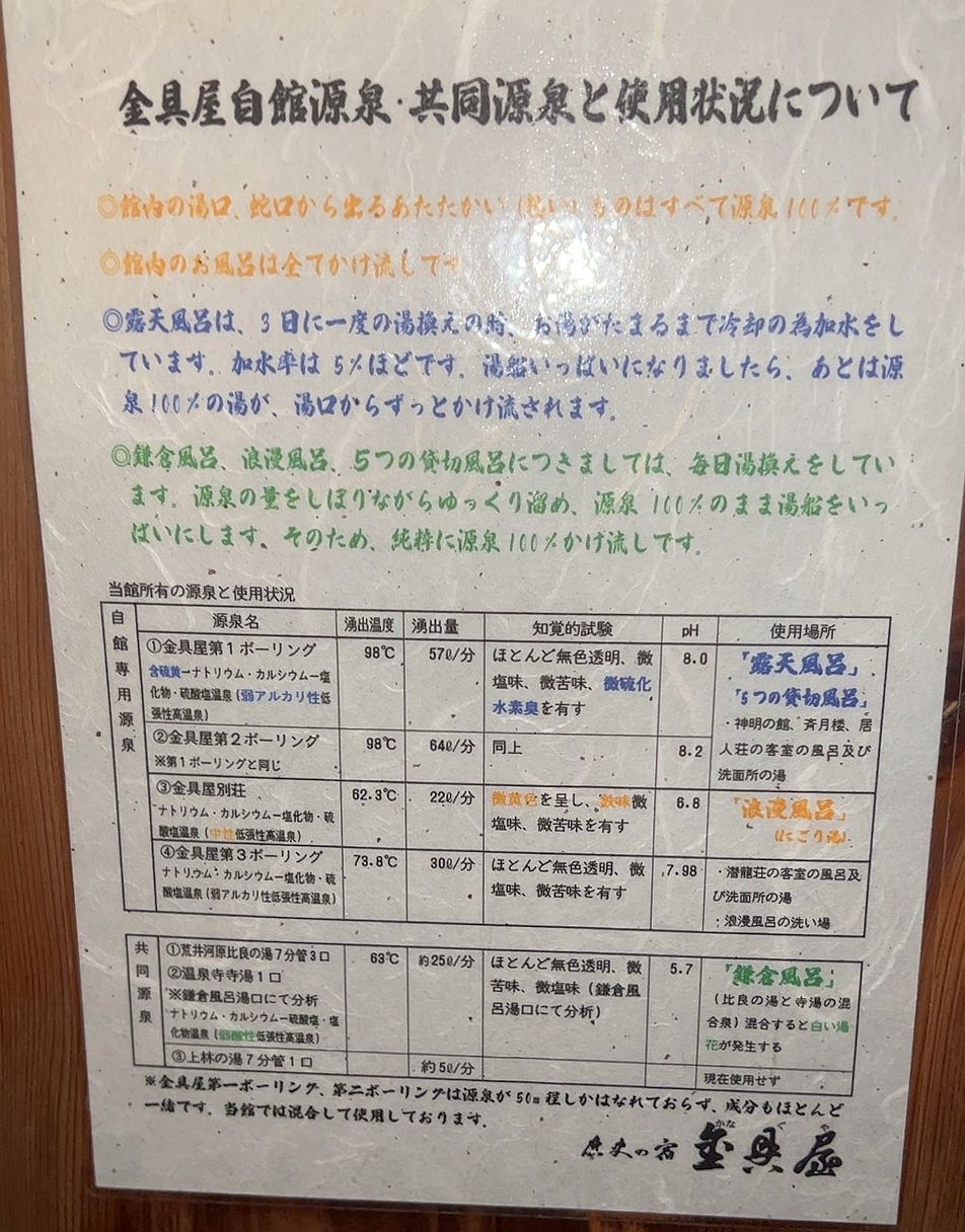 温泉成分分析書の掲示義務はありませんが、温泉の成分に影響を与える項目(加水、加温、循環、消毒の有無)は掲示義務があります。当施設は義務表示が読みにくいものの、適正表示の部類と思います。できればこちらの温泉旅館のように温泉分析書とは別に、湧出量やお湯の入替まで掲示されることが望ましいと思います。