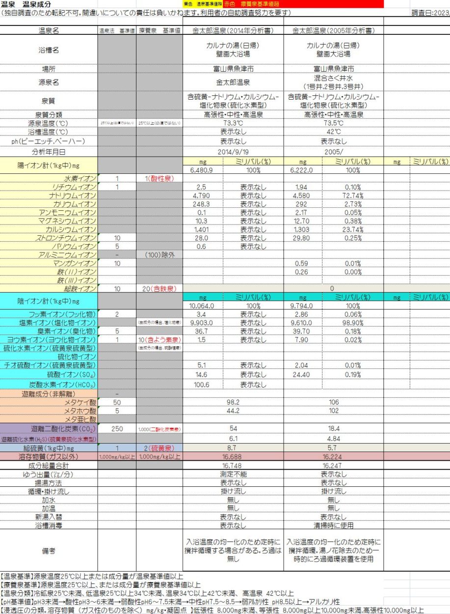 浴場に掲示されている表示を見ると、温泉法で義務付けられている内容(加水・加温・消毒等)がしっかりと表示されているものの、温泉分析表については成分の分量のみ表示されていて、温泉分析書マスターとして分析書を読み取る一番の楽しみの「ミリバル」の数値が表示されていないのが残念。療養泉は基本的にこの数値によって泉質名の表示順が決められているので大事な指標。