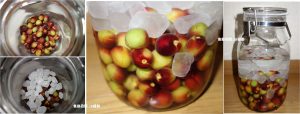 ↓ パープルクィーンの梅仕事。ヘタを一個づつ取って氷砂糖と35℃焼酎に漬け込む↓