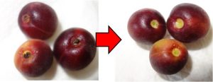 ・果実の大きさは小(6g程度)、果皮の地色は緑、果皮の着色は極多、着色の濃さは濃、着色の形はほぼ全面。