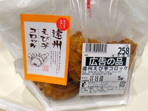 「豊岡・磐田えび芋を味付けしそのままコロッケにしました」。遠州海老芋ファンとしては嬉しい限りです。