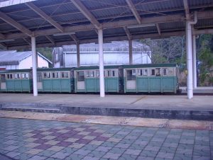 食彩品館.jpが乗っていた頃のトロッコ電車は架線集電式だったが、1989年に観光用として運行されたトロッコ電車はバッテリー機関車が客車を引っ張っていました。
