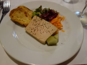 ランチは1700円と2100円があるのは以前と同じ。「お祝いなので2100円」にしようということで、さらに追加300円でフォアグラと鶏白レバーのテリーヌを自分だけオーダー。