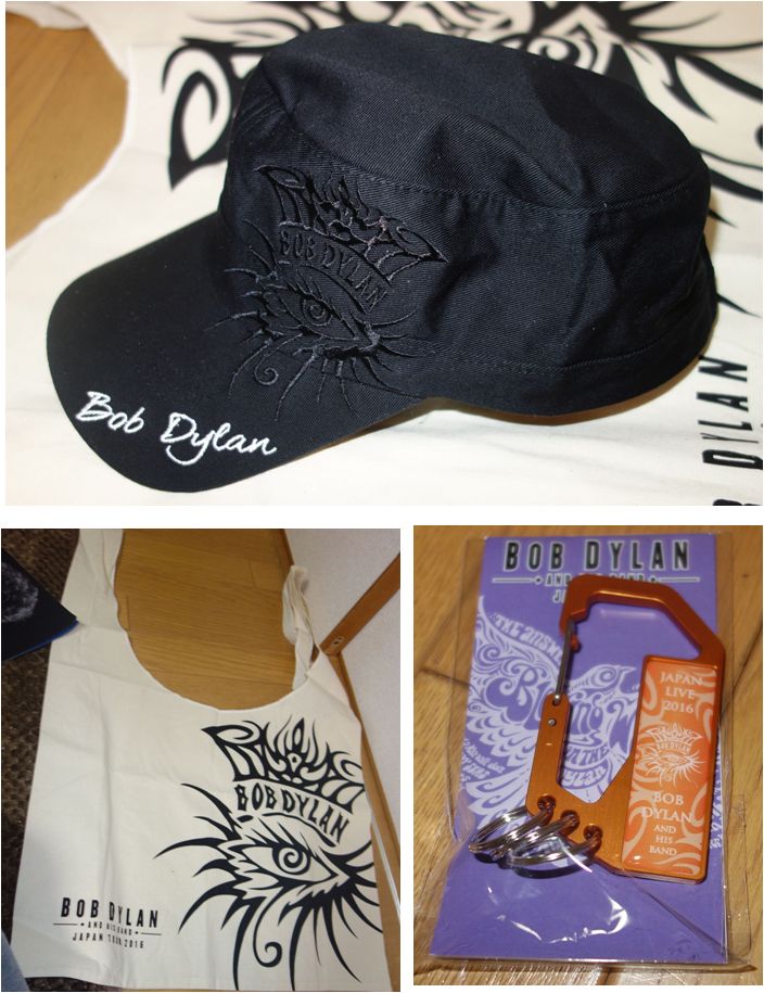 私の行った名古屋のコンサートでのボブディランを振り返る前に、あれこれ購入したグッズを覚書的に記録しておきたい。フレックスで早朝出勤して午後早々に 仕事を切り上げ、コンサート会場に向かう。到着したのはコーンサートの2時間前。グッズ先行販売の列には20名ほど。こりゃ楽勝だと思ったのだが、先行販 売は4人の売り子さんに対してそれぞれ一人の客が対面販売のため結構、時間がかかる。事前に日本公演で販売される予定のグッズを調べていたので目的の品を 忘れずに購入。コンサートグッズ購入では今回が今まででイチバン金額を使ってしまいました(笑)。