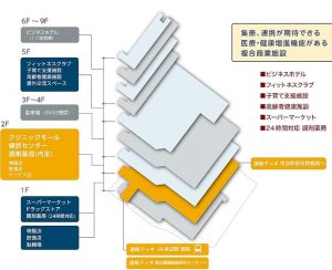 連絡デッキで「JR岸辺駅」「国立循環器病研究センター」「市立吹田市民病院」と直結する地上9階建てのビル。