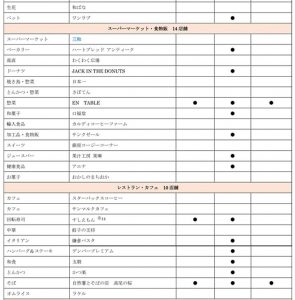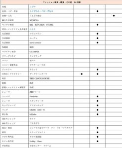 ・スーパー三和,スーパースポーツゼビオ,ノジマ,トイザらス・ベビーザラス,ニトリ,アニマルカフェ,等、核テナント5店舗、モール専門店115店舗の計120店舗。