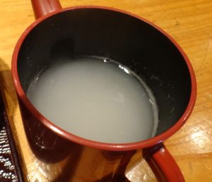 さていただこうかと思ったら蕎麦湯が運ばれてきた。開店直後だが蕎麦湯は濃い。別あしらえの蕎麦湯ですが、昔は「蕎麦湯が濃いは蕎麦屋の恥」と言われたが、最近は蕎麦湯が薄いとクレームを言う客がいるとかで、わざわざ濃くするらしい。