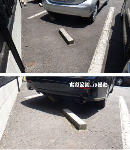 店裏の駐車場が、後方壁面に向かって垂直に駐車する形から、斜めに駐車枠が変更になり止めやすくなった分、車止めはそのままの形なので目印にすると車が駐車場枠からはみ出す。