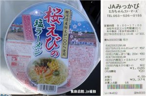 乾燥具材に駿河湾産桜えびのみを使用。以前は「氷結乾燥法で作る麺」で特許を持っていた北海道の「とかち麺工房(中川郡幕別町)」で製造されていたが、事情があって現在は「渡辺製麺とかち帯広事業部」が用地・設備を取得し事業継承。ちなみに渡辺製麺は“博多一風堂”で有名な「力の源カンパニー」の子会社です。そして信州ではお馴染みの蕎麦屋さんも運営されていますね。もちろん乾麺も有名です。