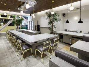 4.シーンや時間帯によって照度を調節する店内照明、音質にこだわったJBLのスピーカーを設置。テーブルの高さやイスの座り心地にもこだわり、居心地のよい空間づくりを目指しました。