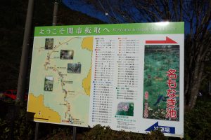 ナビの場所は『風土や』(岐阜県関市板取400-1)を設定。駐車場は池に一番近い場所、すなわち神社鳥居前に障碍者用が設けられているが、一般車は「風土やさん」の道路向かい、板取川側の駐車場に停める。