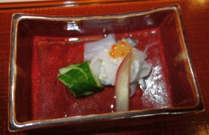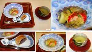 ・氷頭(ひず)なます,蛇腹胡瓜,縮み蒟蒻,酢取茗荷,いくら,土佐酢。
