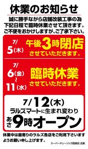 スーパーチェーンシガ3店を同時改装し、ラルズマート西部店、黒川店、入舟店(北海道余市郡)2018年7月12日オープン。