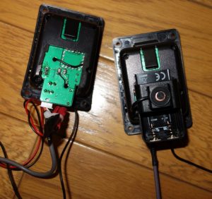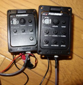 ↓ 左側がウクレレについていたプリアンプ。右側は電池付き(マイクがついているのは右側左側では機種が違うので)↓