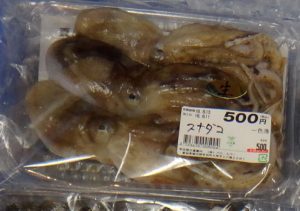 頭足綱八腕目マダコ科なのでマダコの親戚。これも初めて売場で見た魚種。もしかすると一般には「タコ」の表示で売られているかもしれないが、この店では「スナダコ」ときっちり表示されているのが素晴らしい。