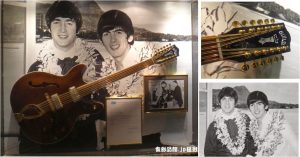 このギターの謂れはともかく、私が感心したのはハワイとは縁もゆかりもないこのギターにハワイ観光のジョンとジョージの2ショットを画像を組み合わせて、且つ、ジョンが持っているかのごとく展示していること。