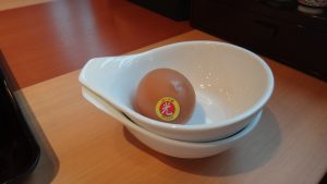 生玉子は2個の入れ物に入って提供されます。牛丼の「すき家」と同様にサルモネラ対策も兼ねて、玉子の殻が割った後の中身に触れないようにするための配慮ですが、客はあまり気にしないので玉子を入れて出された容器に玉子を割って中身を落としていることが多い。