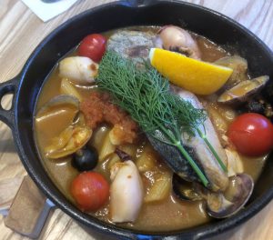 アクアパッツァに使うならば真鯛とかの白身が食べやすいのですが、海が荒れていたんでしょうね。それでもミニトマトや野菜がおいしく、そして味付けもグッジョブ。