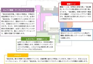 ・フロアは書籍ゾーン、文具・雑貨ゾーン、ライフスタイル体験型のセレクト物販・ワークショップゾーン、そしてレストラン・食物販ゾーンで構成