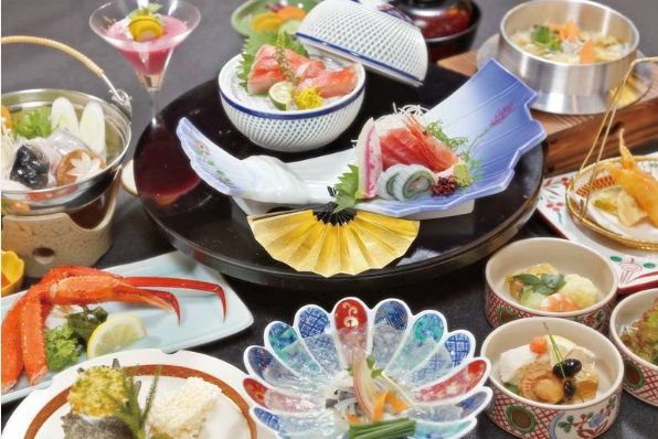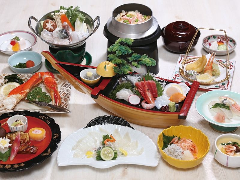 季節の会席料理,かに食べ放題,まぐろ会席,海鮮づくし,松茸会席(季節限定),ふぐかに会席(季節限定),といった料理が紹介されています。