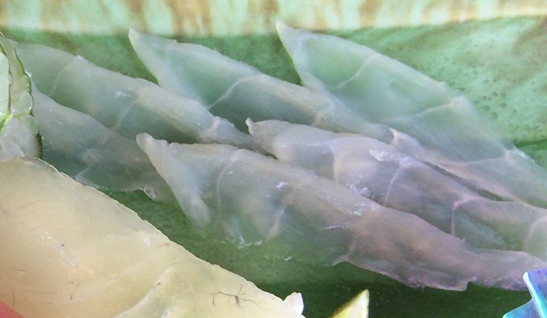 おそらく冷凍身欠きふぐと推測。今まで見た中で最薄。なかなかの技?です。