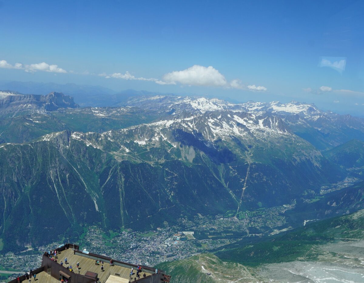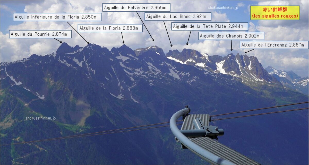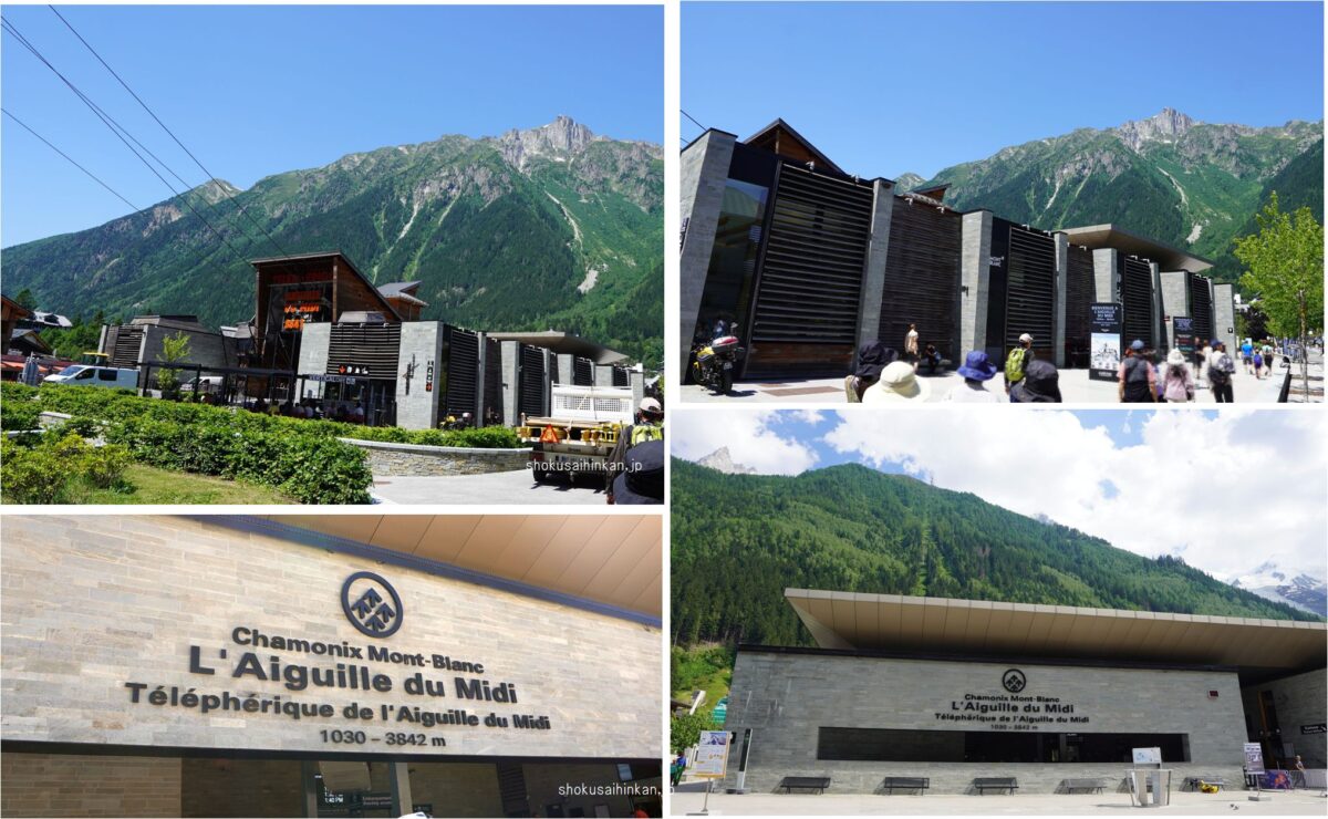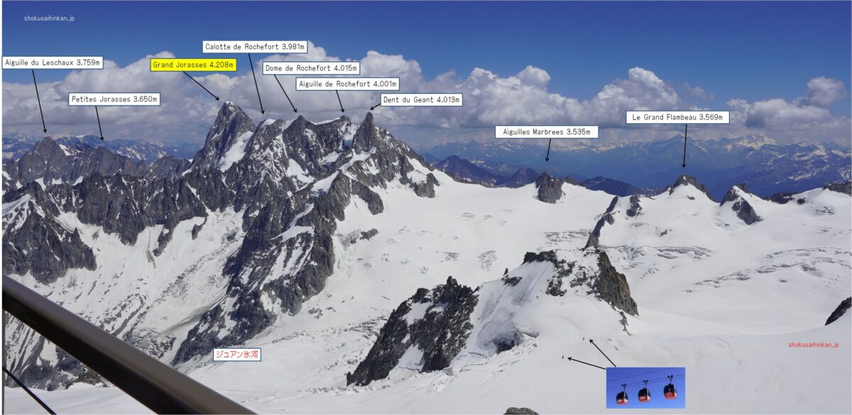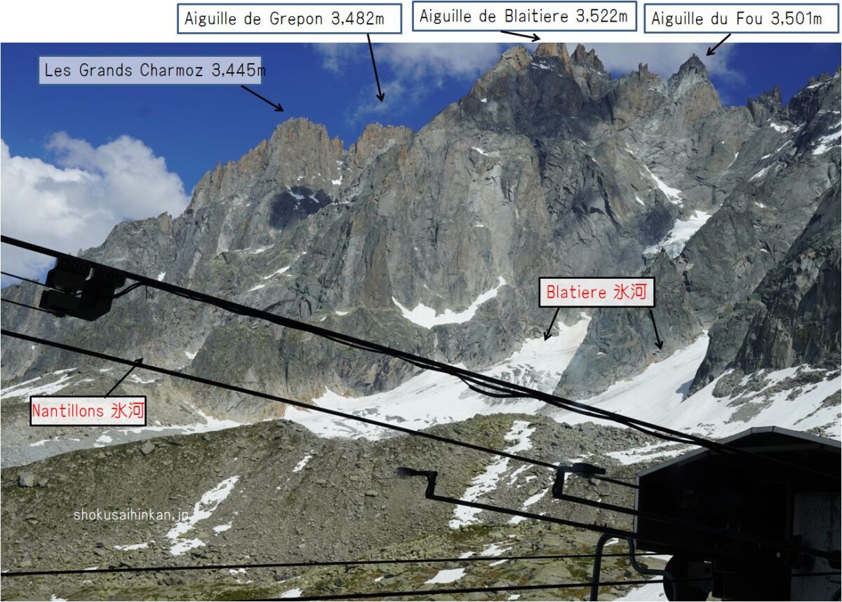 麓のシャモニー(フランス)からロープウェイで1回乗り継ぎして、乗車時間だけだと20分程で標高差2,800m(上図Bの矢印)を移動。