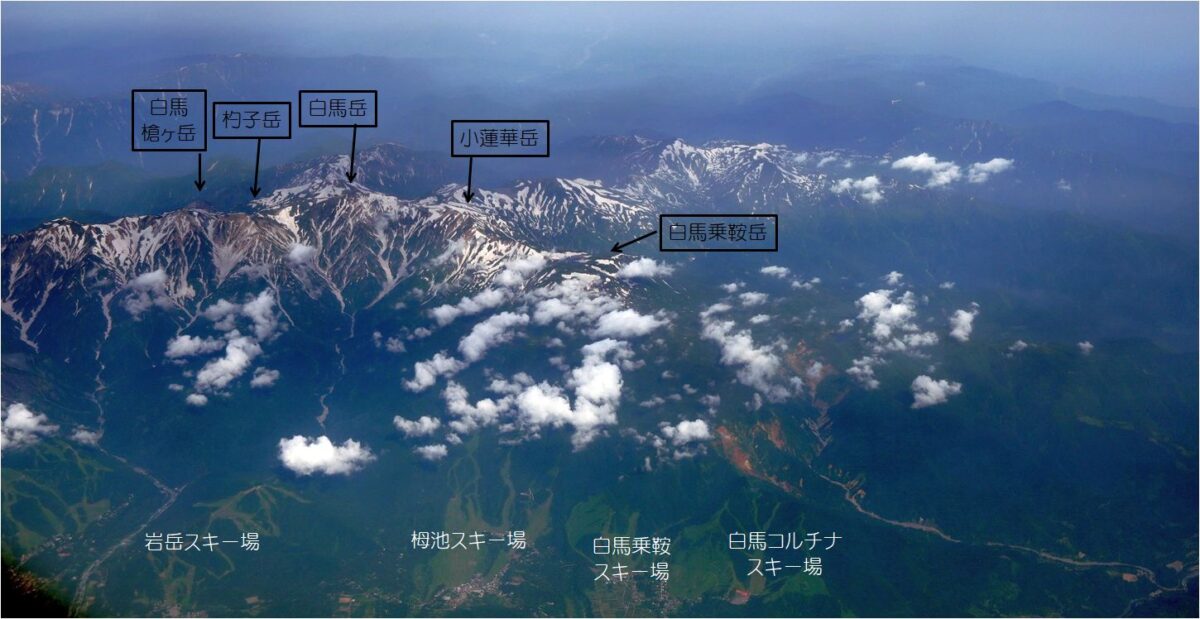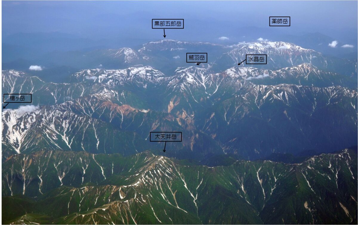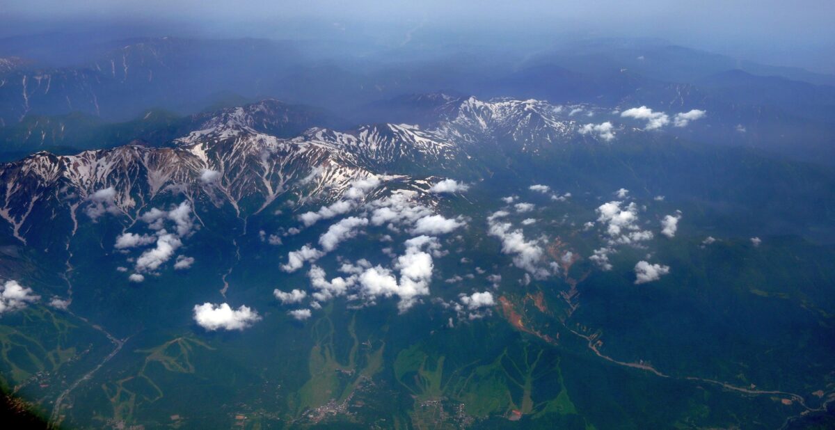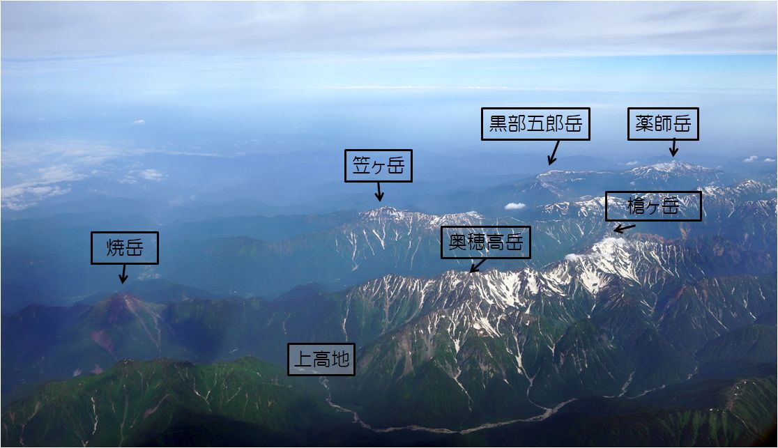 長野上空で後立山連峰から北アルプス、乗鞍、御嶽まで綺麗に見えた。日本の山も美しい。