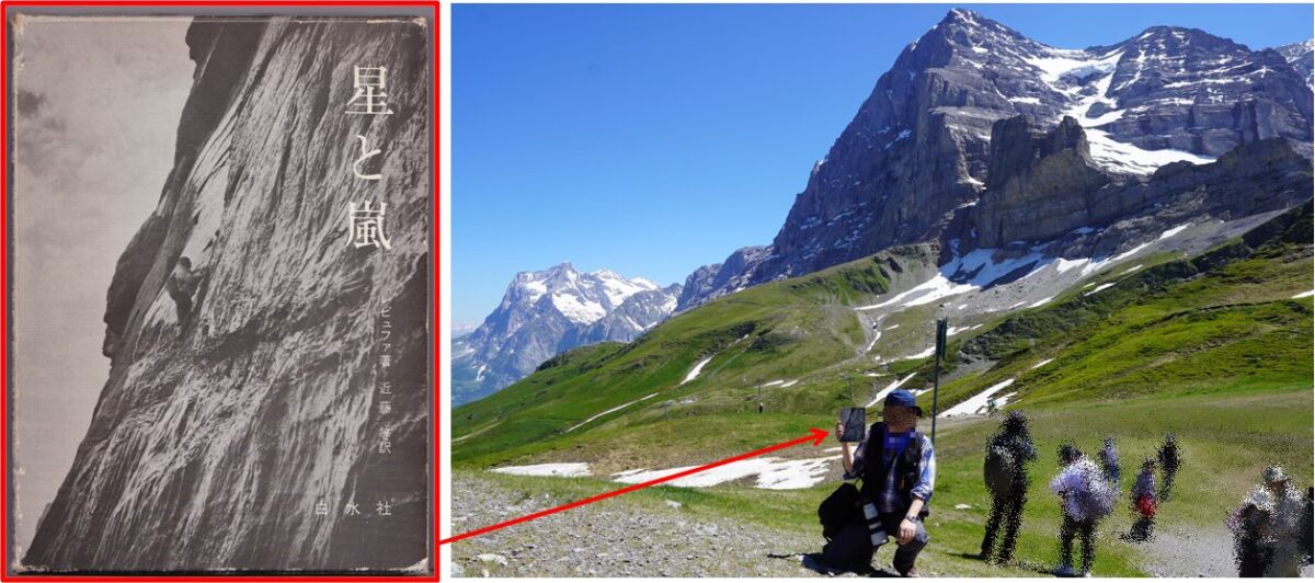 グランドジョラスと愛読書の「グランドジョラス北壁(小西正継)」を掲げて記念撮影。これで「三大北壁と愛読書を掲げて記念撮影」という今回の旅行の最大課題を達成できた。感無量。