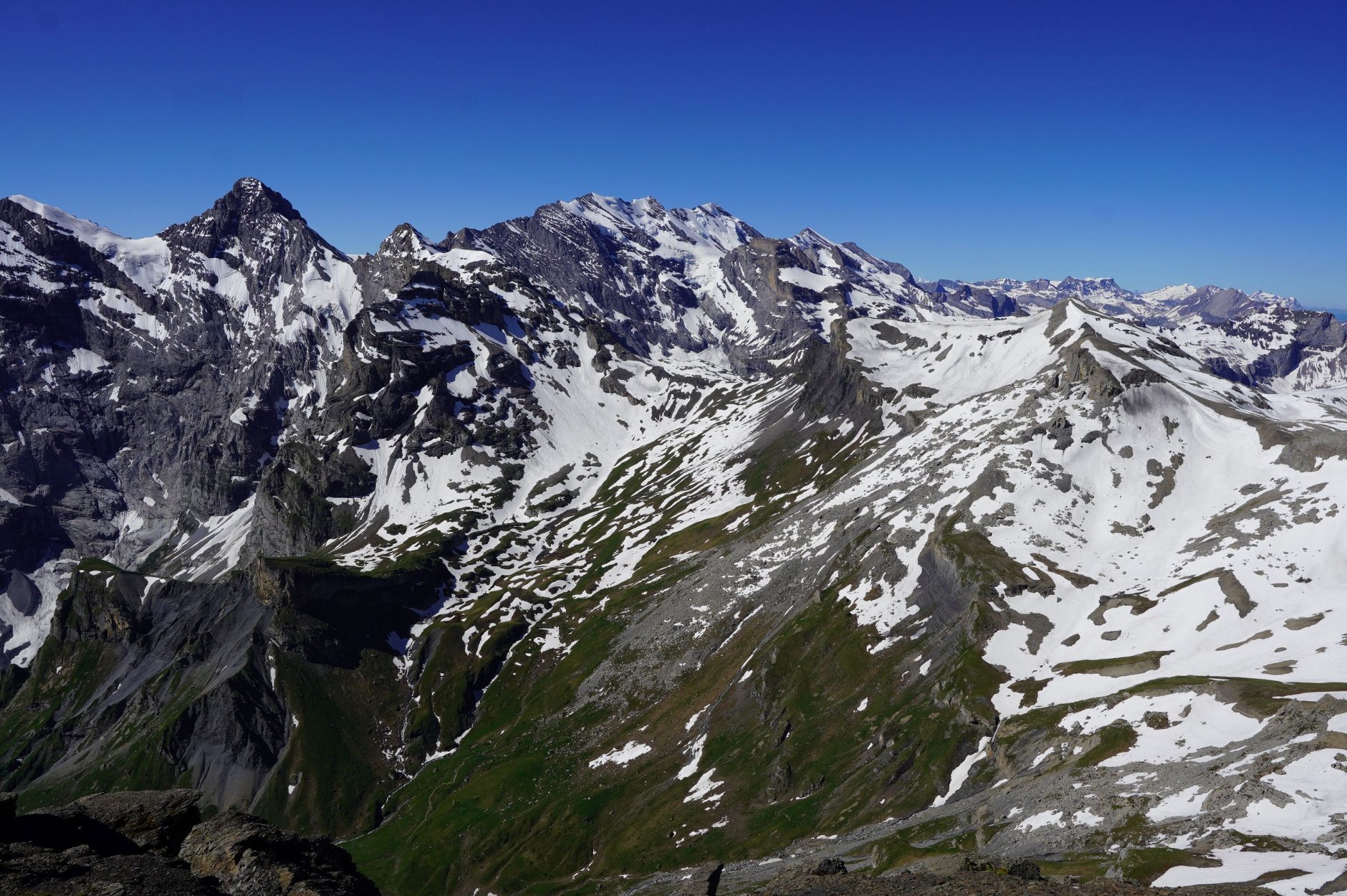 前山(シュヴァルツメンフ,Schwarzmönch,2,645m)で見えなくなっていたオーバーラント三山が見えてきます。アイガー北壁も。