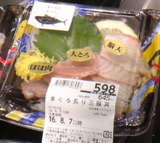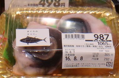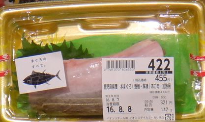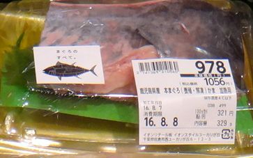 イオンの鮮魚のまぐろ売場「まぐろのすべて」には、クロマグロ(本まぐろ)、メバチ、キハダ、ビンナガ、ミナミ等の5種類があり、それぞれ“天然”“養殖”、さらには“生”“冷凍”“解凍”が、そしてスーパーマーケットでは取り扱わないような部位まで品揃えされている・・・・・と期待するが、たいていはそこまでの品揃えは岡崎南店ではリニューアルオープン当日といえども品揃えはされていない。