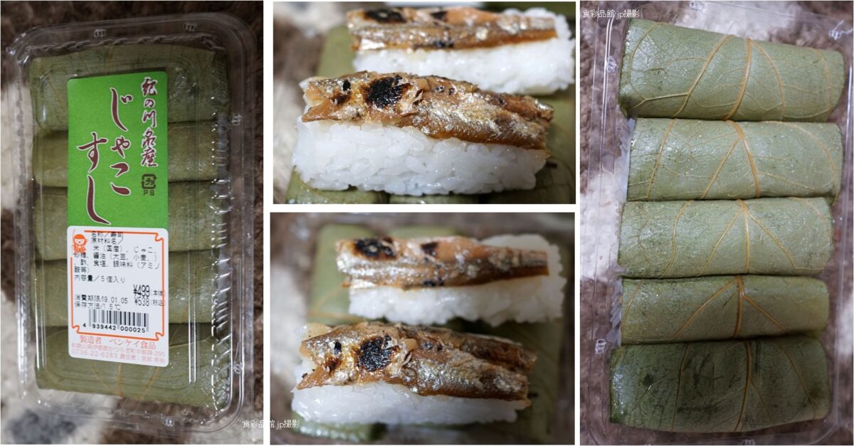 “じゃこ(雑魚)”といってもちりめんじゃこではなく、紀の川では川魚のこと。外観から推測するに、オイカワの稚魚でしょうか。素焼きしてから甘く炊き上げたじゃこを柿の葉寿司にしたもの。美味です。川じゃこは、夏季は握りで食べ、秋~冬は押し寿司にして食べるとか。紀ノ川周辺の郷土料理です。