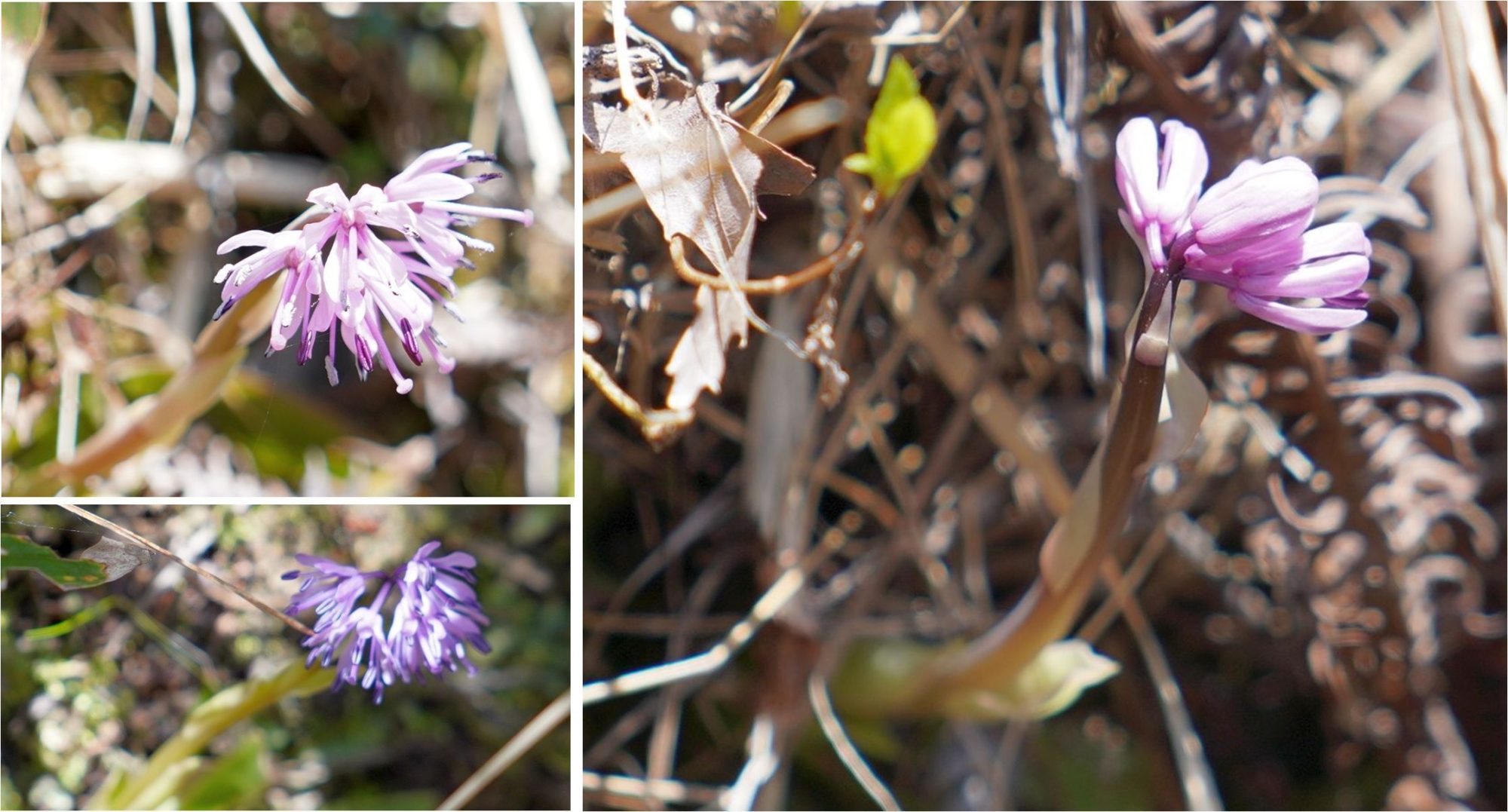 ユリ科の多年草。常緑なので冬でも葉が残り「ここで咲く」をアピールしている。
